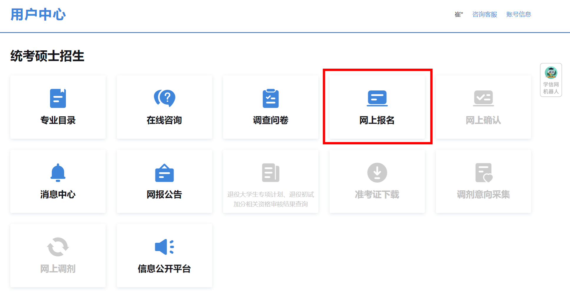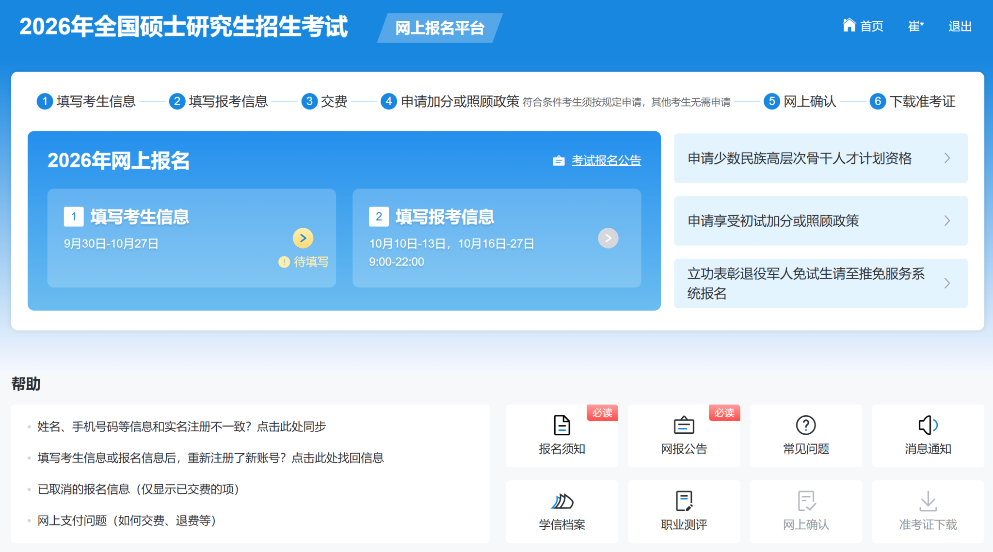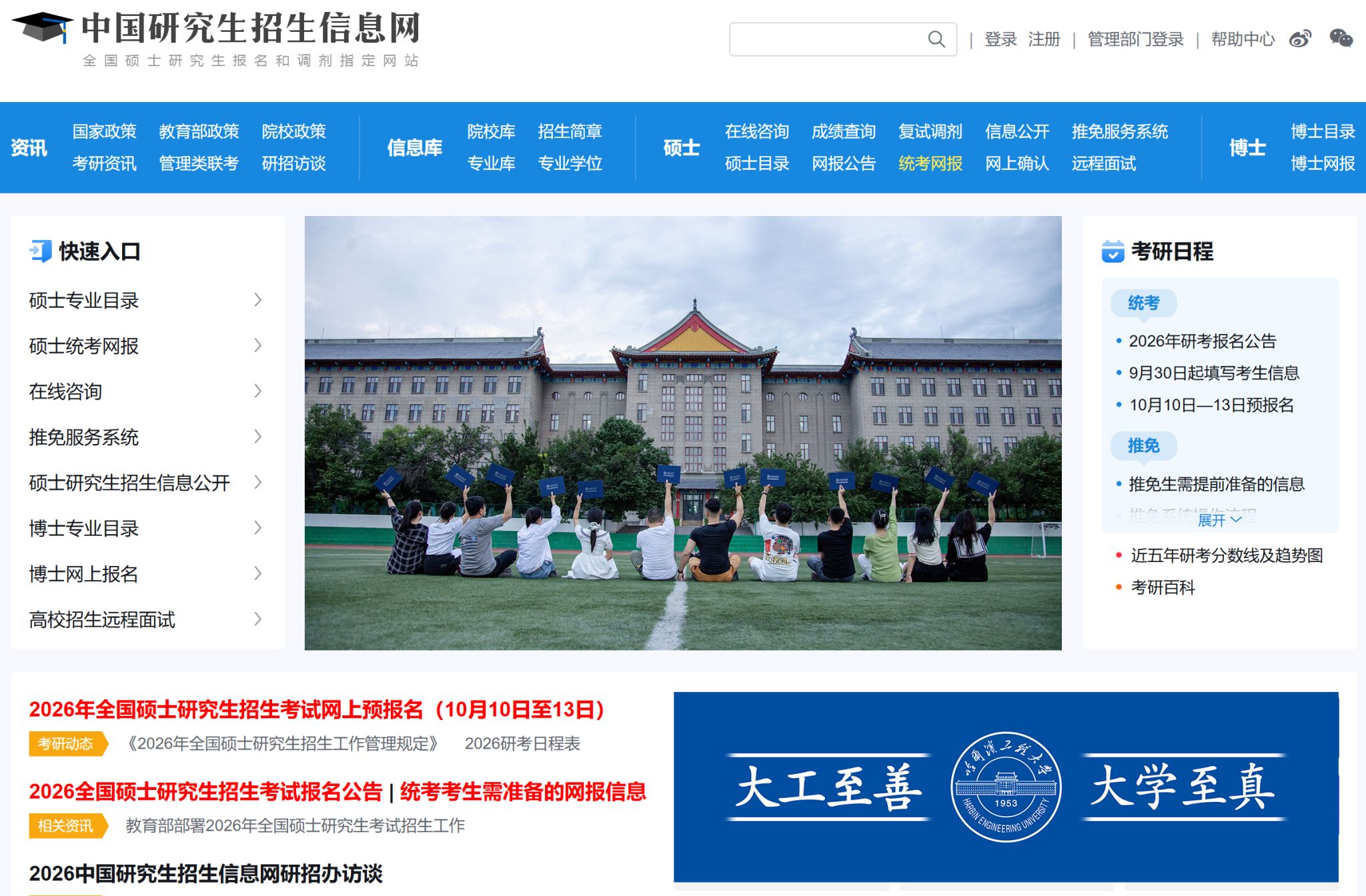 全国硕士研究生招生考试报名包括网上报名和网上确认两个阶段。其中,网上报名时间为2025年10月16日至10月27日(网上预报名时间为2025年10月10日至10月13日,相关工作安排由各省级教育招生考试机构确定并公布),每日9:00~22:00。网上确认时间由各省级教育招生考试机构确定并公布。