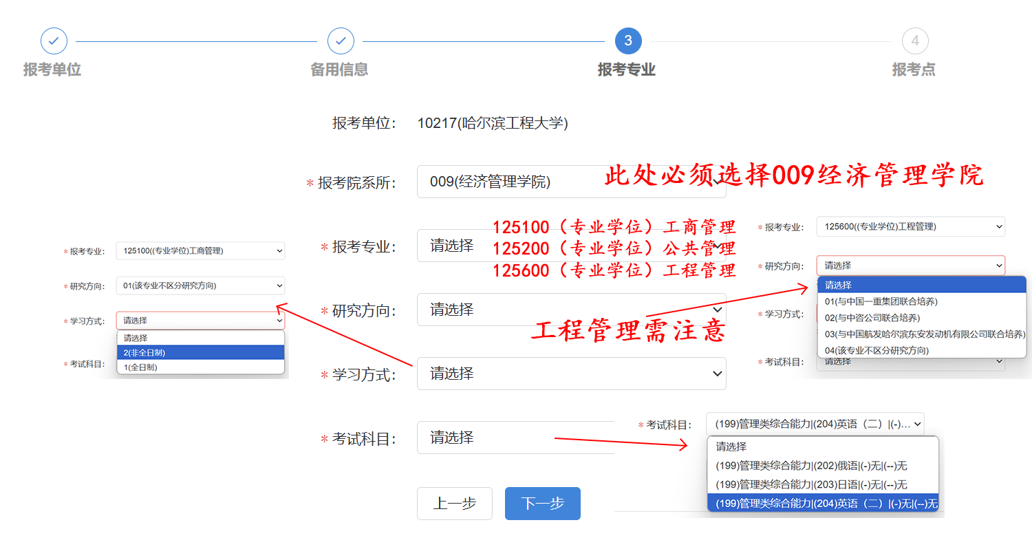 注意:全日制MBA只招收部分教学实践环节在哈尔滨以外完成的考生;MPA、MEM仅招收非全日制;MEM全部教学实践环节在黑龙江省完成。