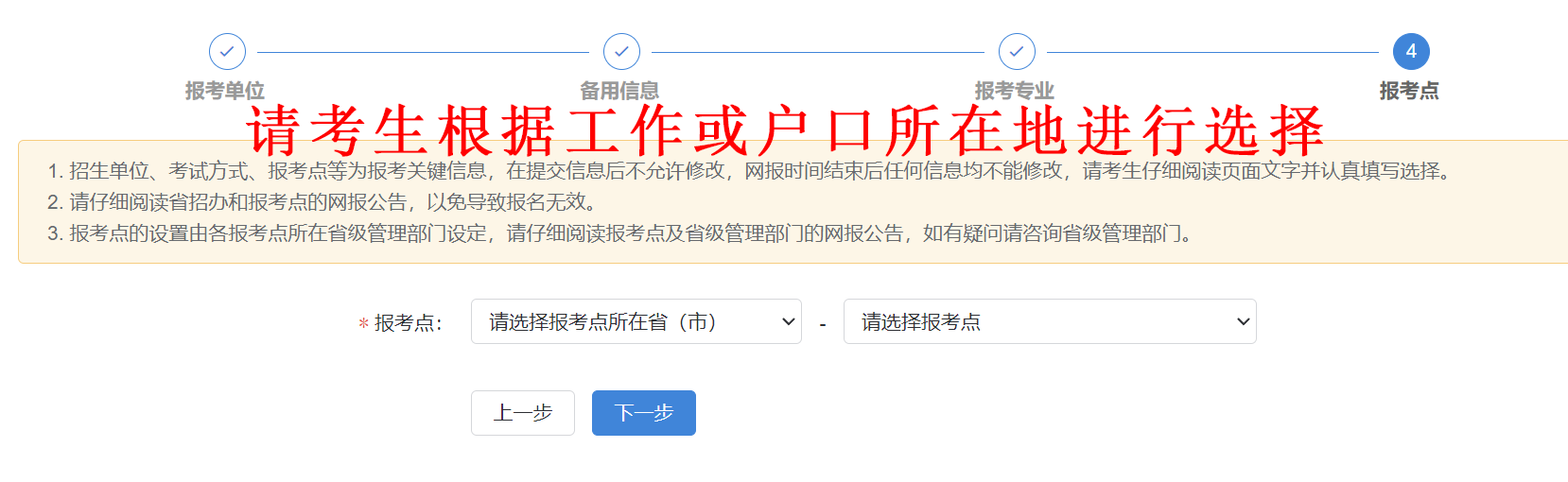 考生应选择工作或户口所在地省级教育招生机构指定的报考点办理网上报名和报名确认手续,报考点信息可在研招网各省招生考试公告里查询。